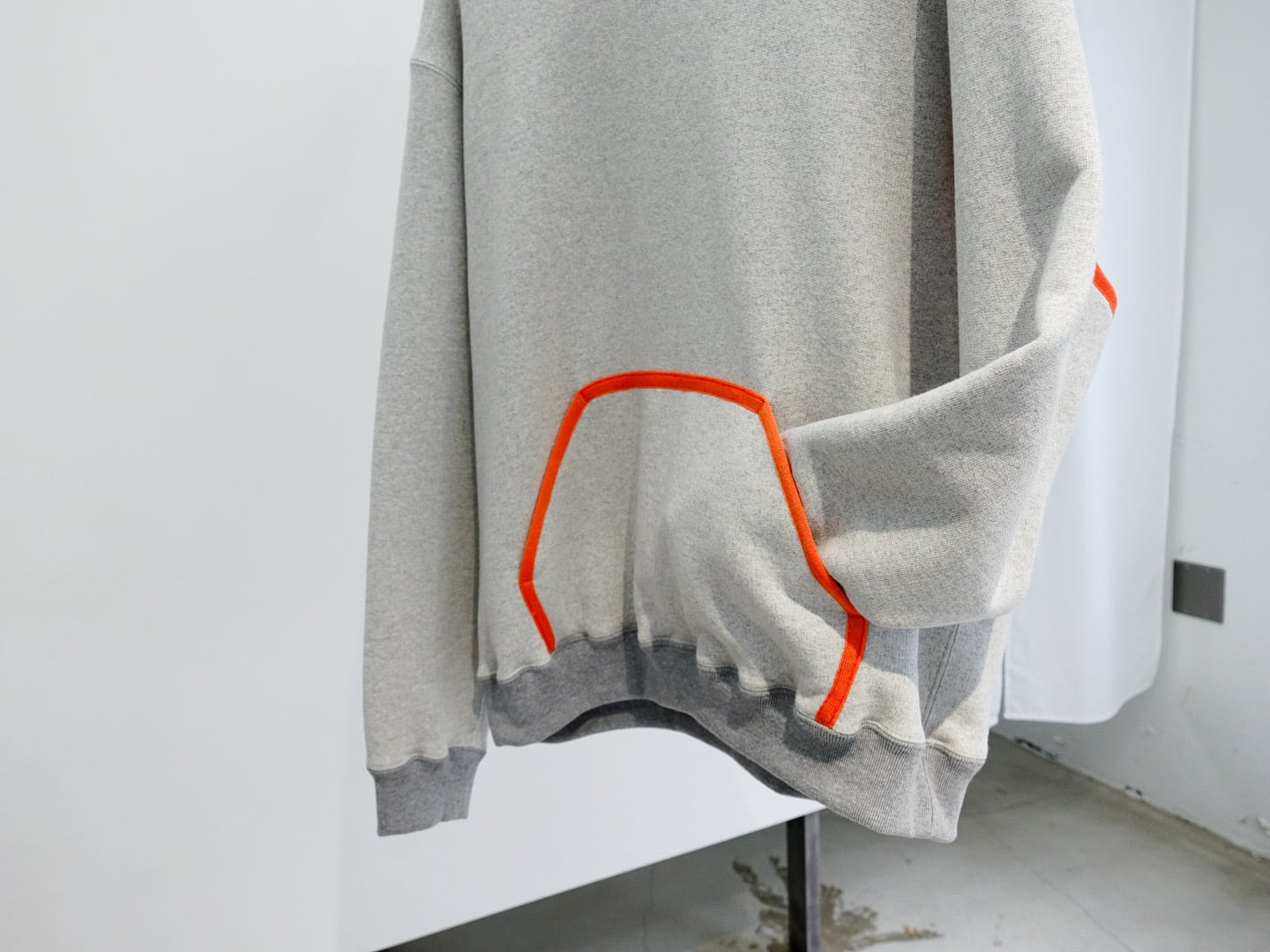 パイピングを施したフーディー。カンガルーポケットのフチを太めに囲っています。