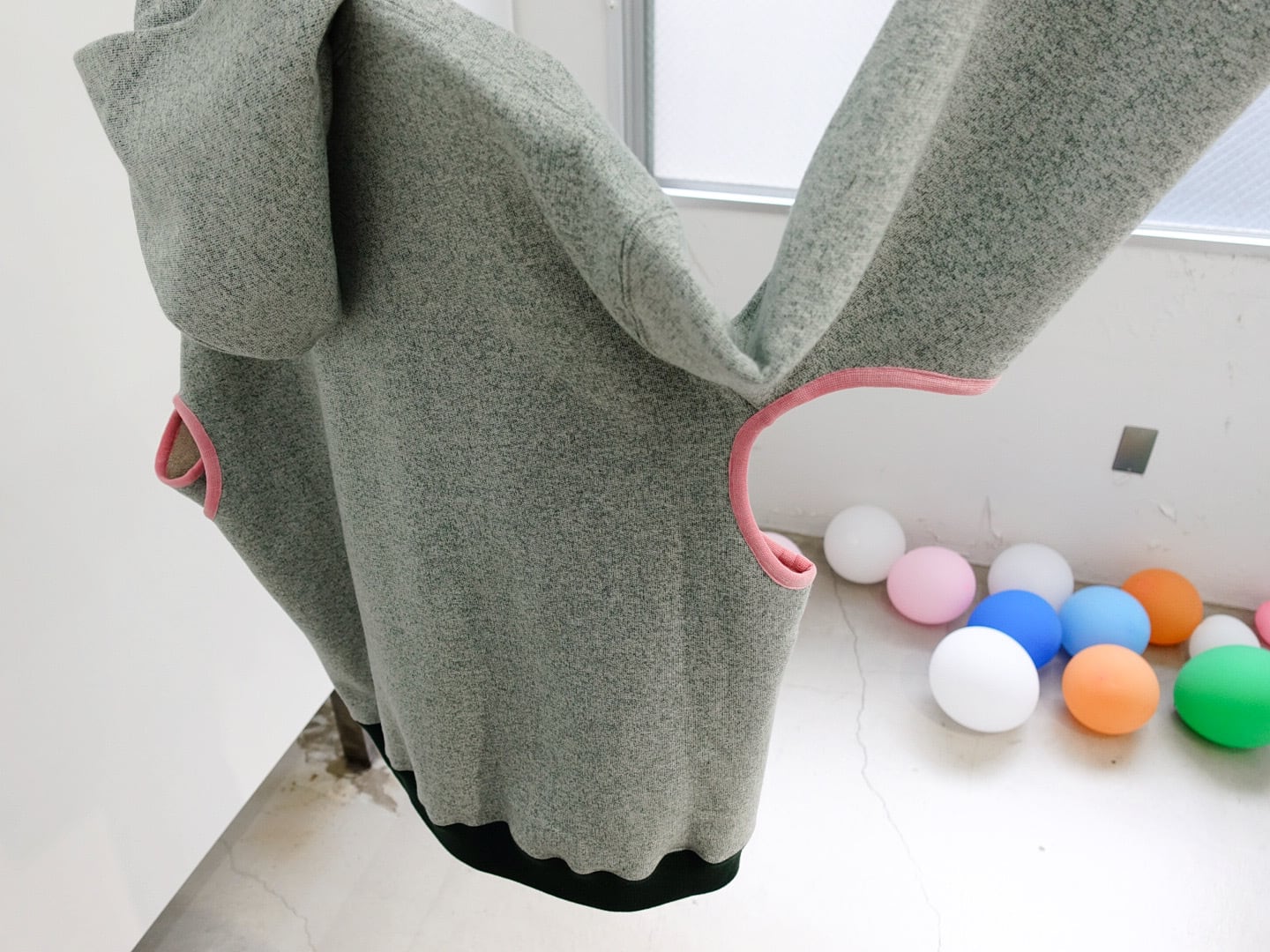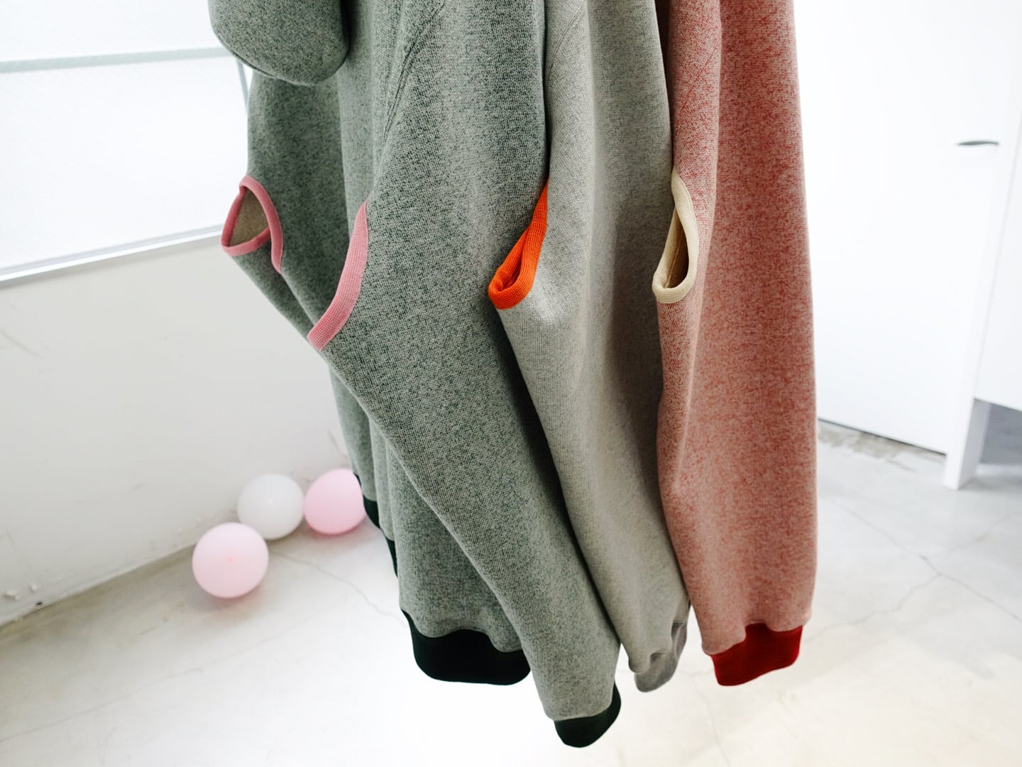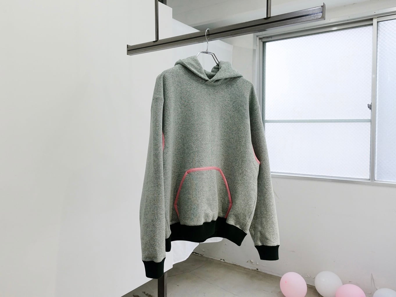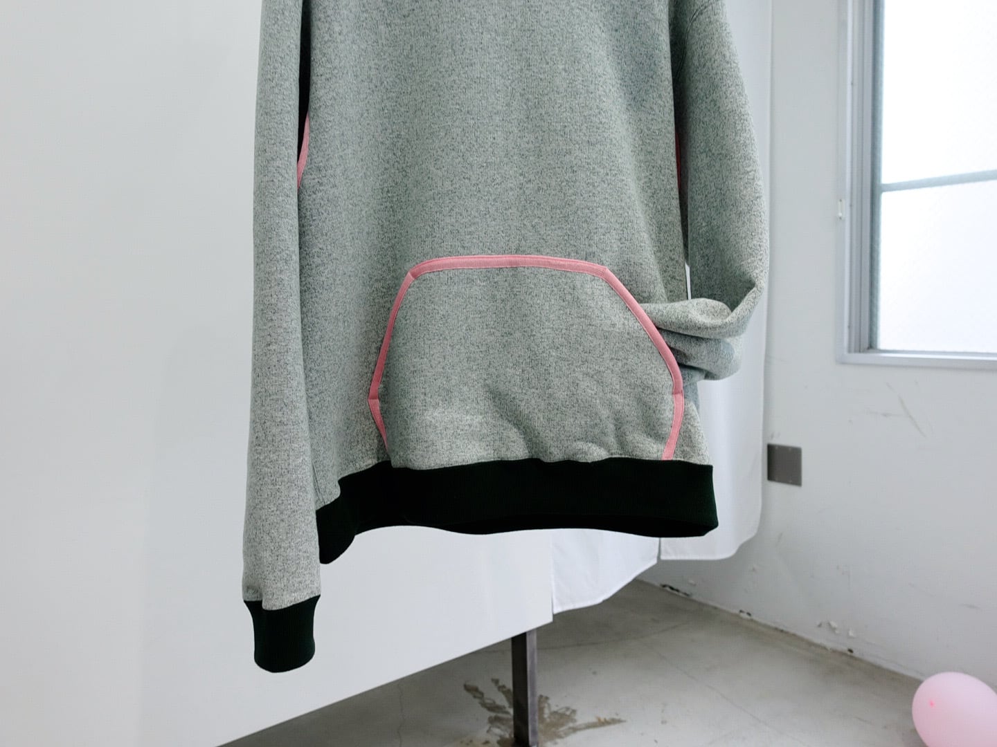 パイピングを施したフーディー。カンガルーポケットのフチを太めに囲っています。